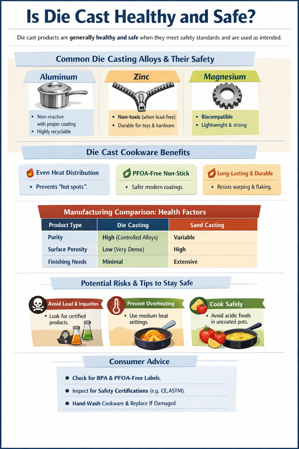 Všeobecne povedané, produkty vyrobené cez tlakové liatie sa považujú za zdravé a bezpečné na každodenné používanie za predpokladu, že spĺňajú medzinárodné bezpečnostné normy a používajú sa podľa určenia. „Zdravie“ odlievaného predmetu závisí predovšetkým od použitého základného kovu (ako je hliník, zinok alebo horčík) a od povrchovej úpravy, ktorá sa naň aplikuje. V súvislosti s kuchynským riadom je tlakovo liaty hliník veľmi obľúbený, pretože je nereaktívny, keď je správne potiahnutý, zatiaľ čo v hračkách a hardvéri je tlakovo odlievaný zinok obľúbený pre svoju odolnosť a nedostatok toxických prísad, ako je olovo.