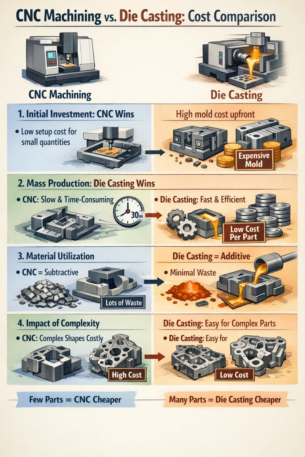 Pokiaľ ide o to, či je tlakové liatie alebo CNC obrábanie lacnejšie, odpoveď v skutočnosti závisí od toho, koľko dielov plánujete vyrobiť.