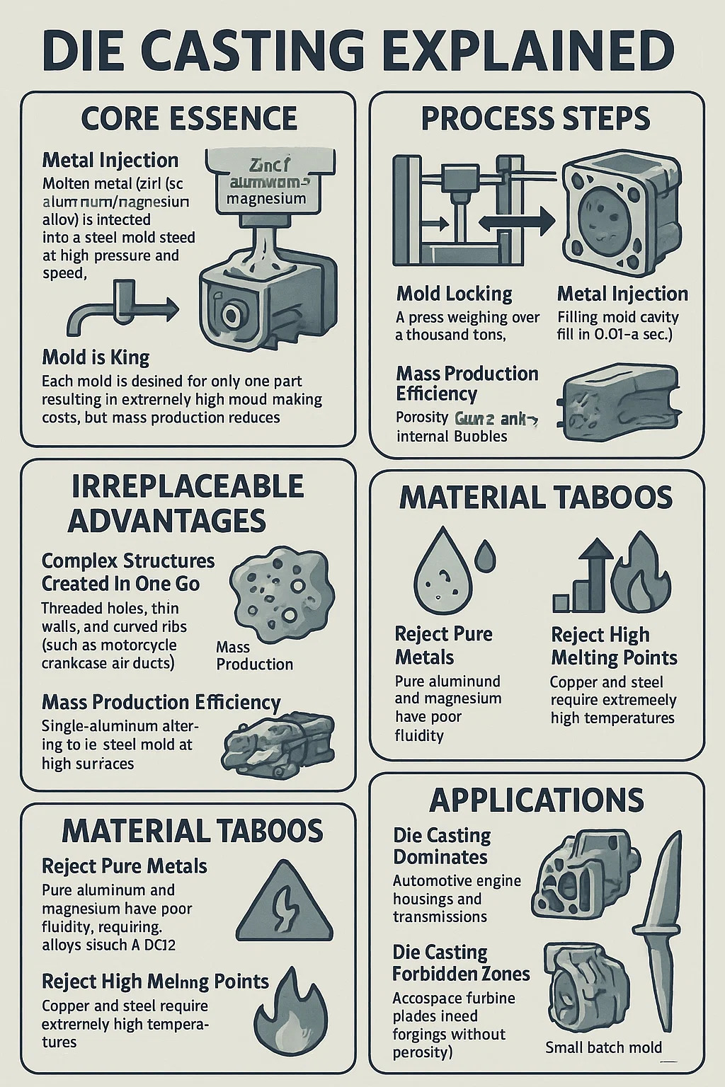 Odmietnutie čistých kovov: Čistý hliník a horčík majú zlú plynulosť a vyžaduje zliatiny (napríklad hliník ADC12 s 10% kremíkom).