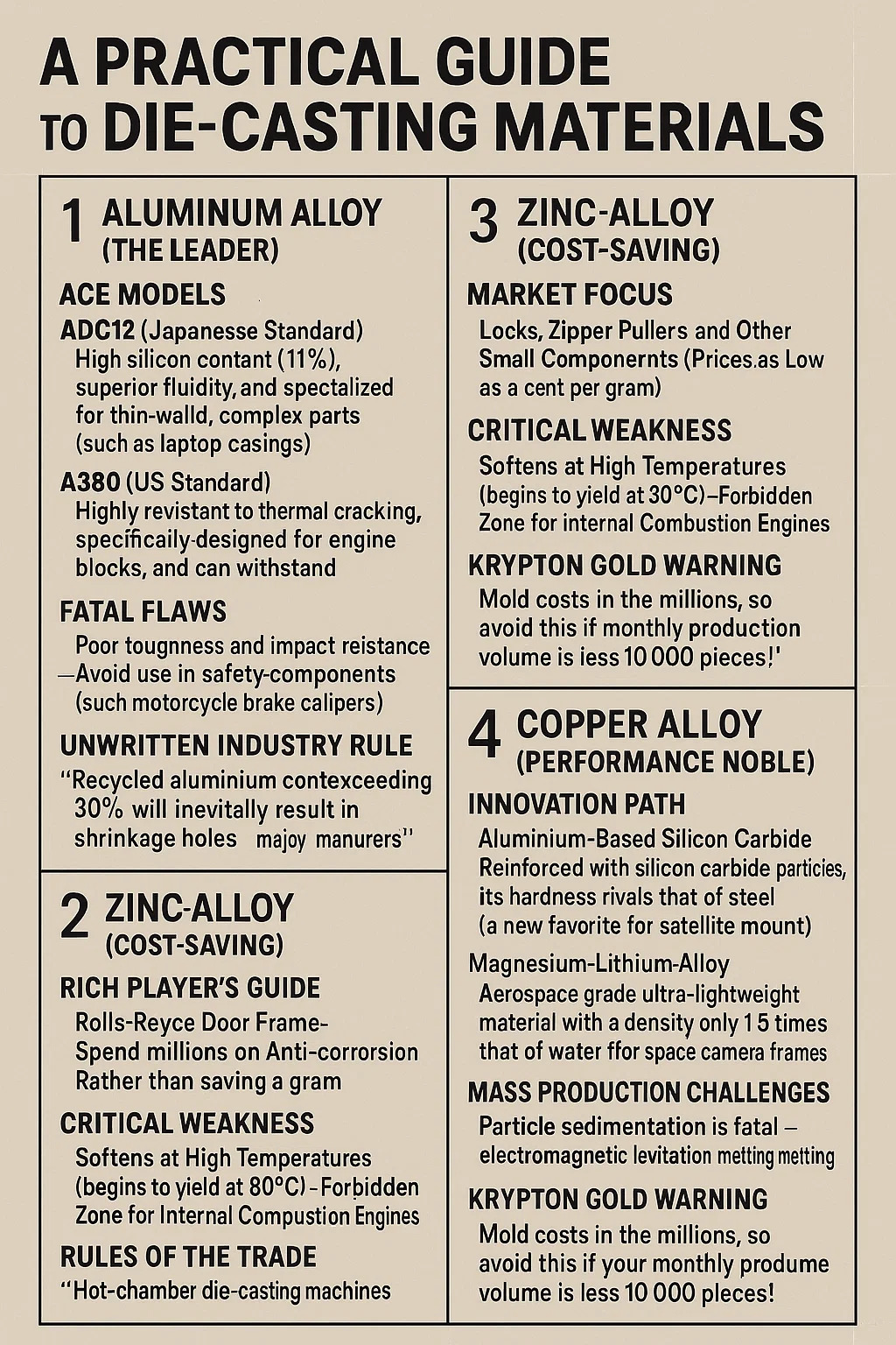 ADC12 (japonský štandard): Vysoký obsah kremíka (11 %), vynikajúca tekutosť a špecializácia na tenkostenné, zložité časti (ako sú kryty notebookov).