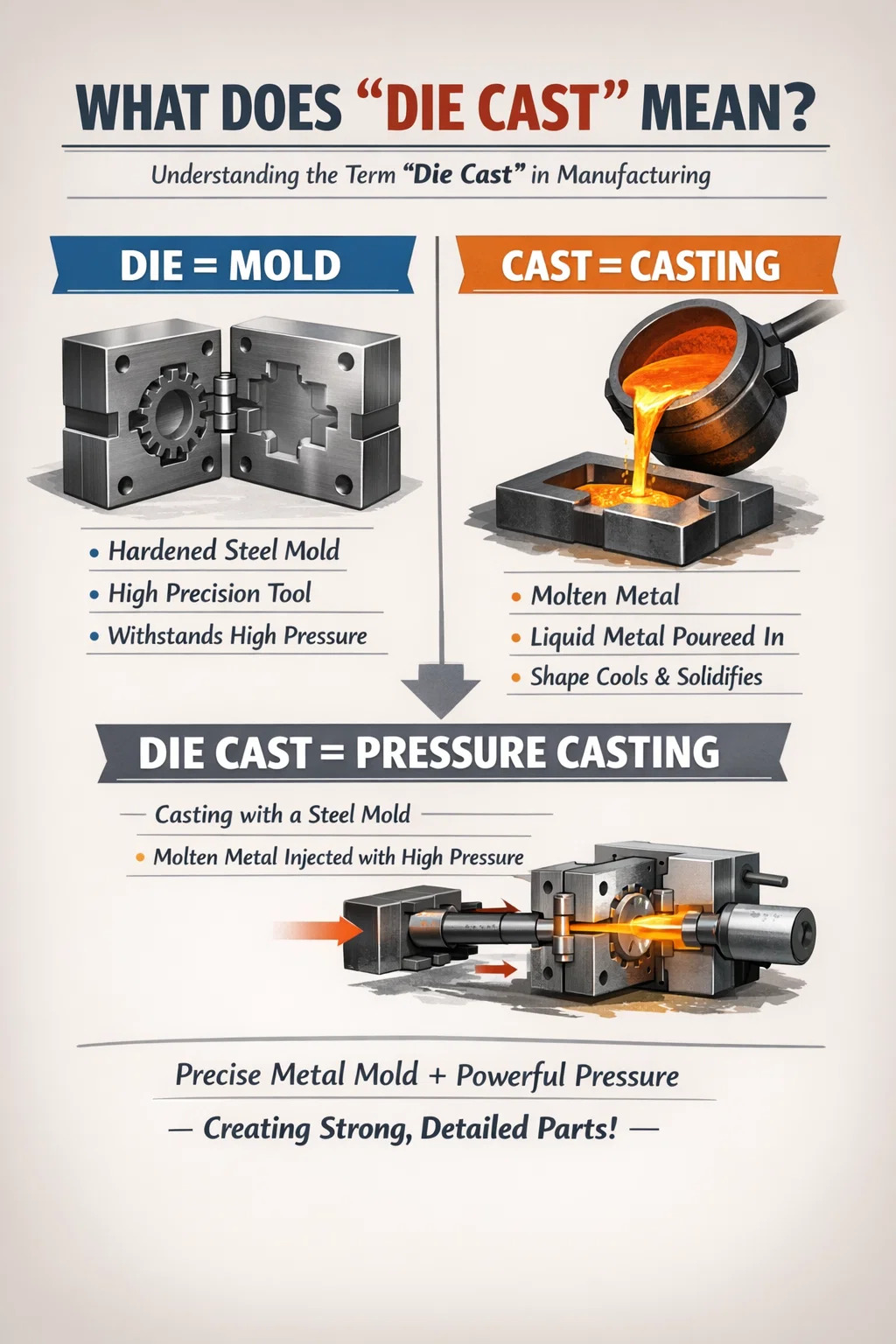 Spojením týchto dvoch slov do „odliatku“ je základný význam: tlakové liatie pomocou presnej kovovej formy.