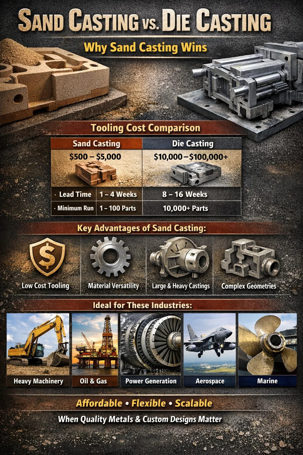Krátka odpoveď: Odlievanie do piesku vyhráva z hľadiska nákladov, flexibility a rozsahu